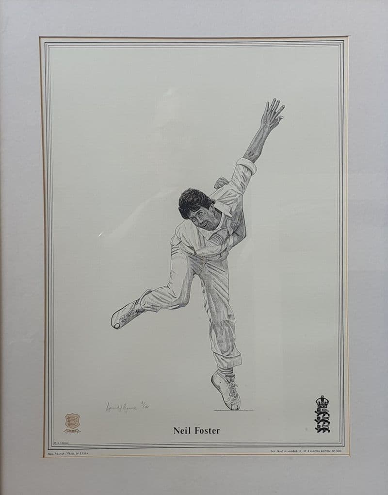 Black and white print by David J Byrne, of the Essex and England bowler Neil Foster; print is signed, with a pencil signature at the bottom of the image; 3 of 500; image is approximately 39cm by 28cm, with white mount around that - and a thin, black frame (c.51cm by 40cm)