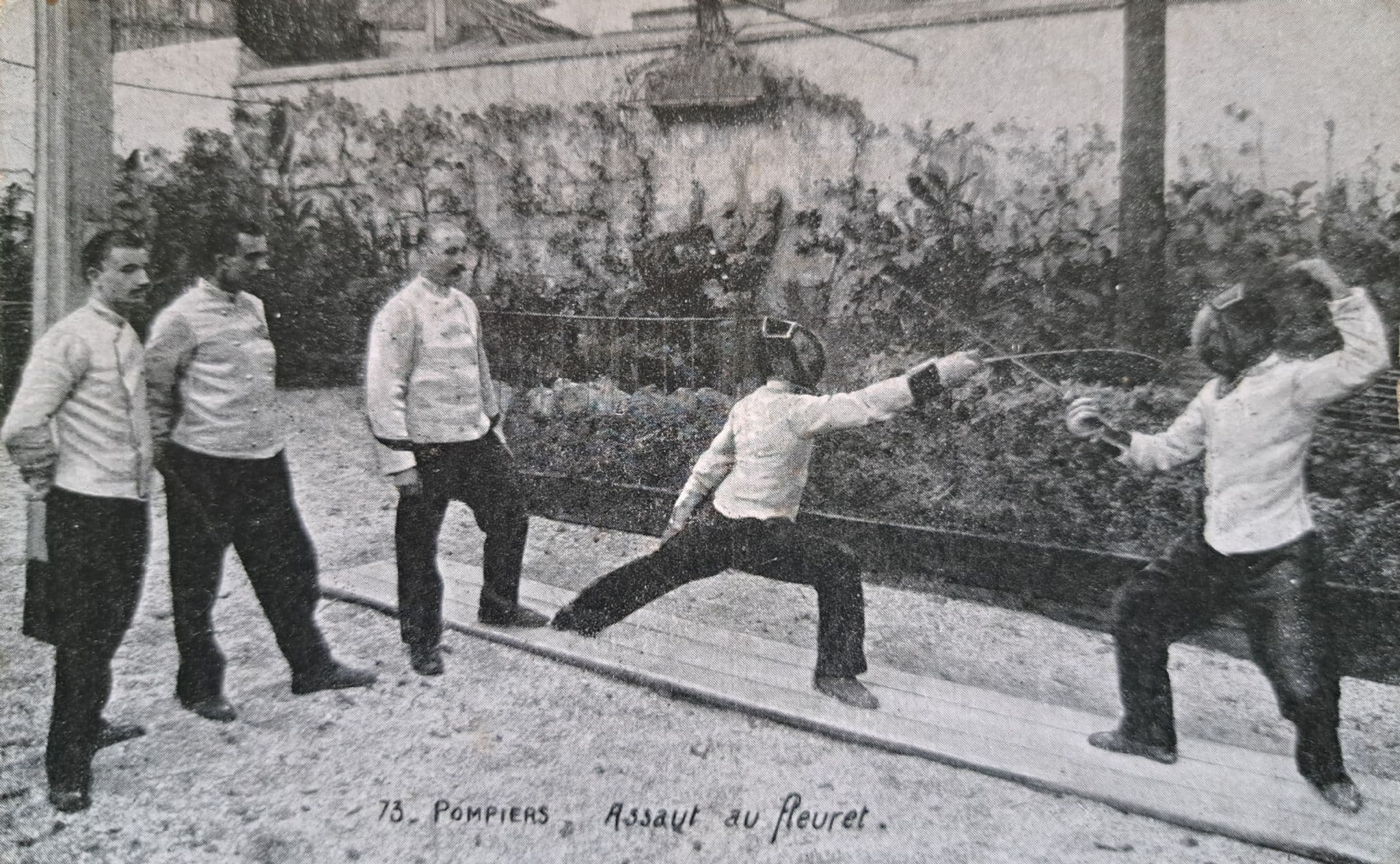 Fencing postcard; "73 Pompiers - Assaut au Floret" to the front; c.8cm by 13.5cm; in good condition, with no writing to the rear