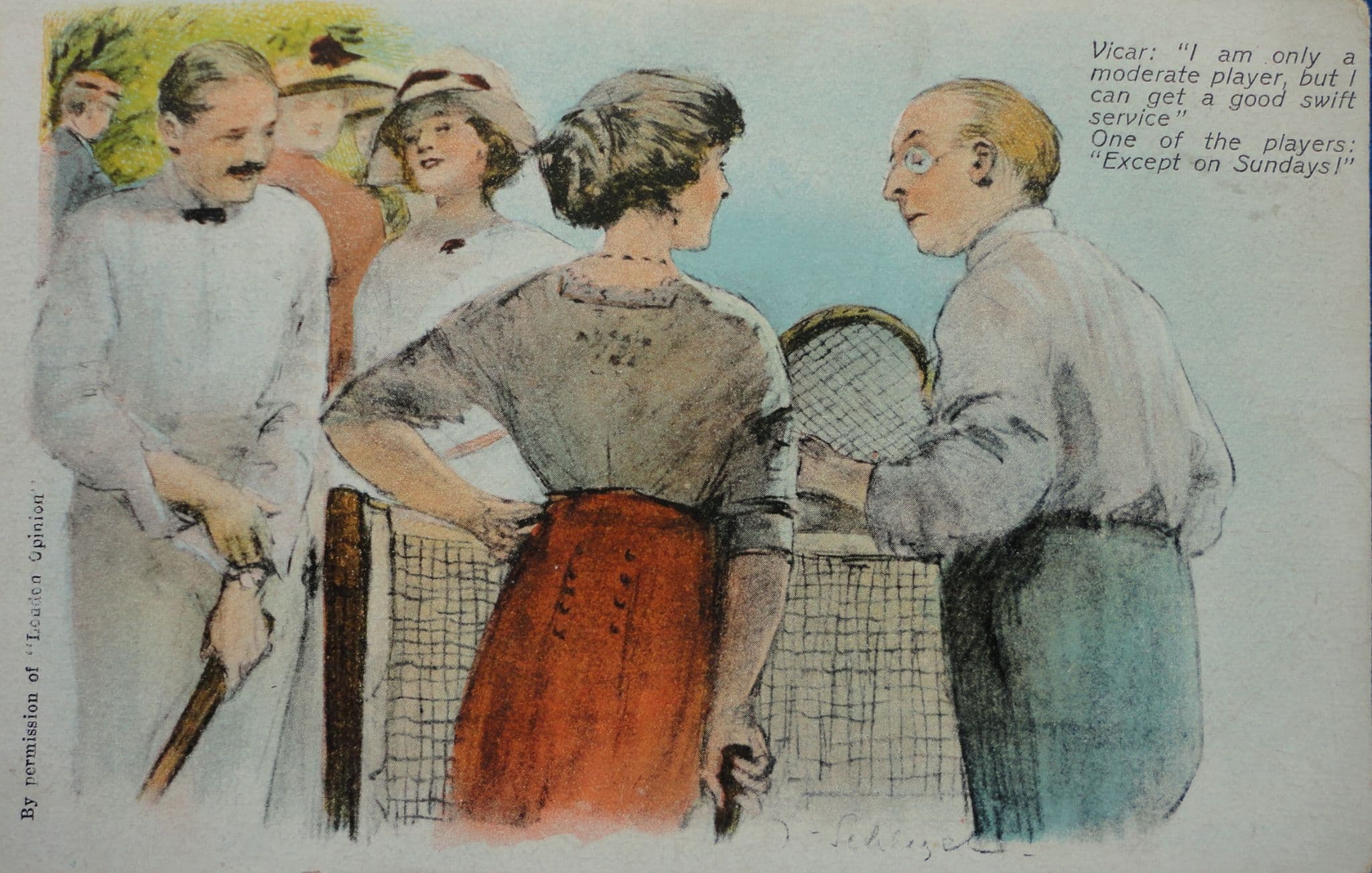 Postally unused card, printed in Saxony, and marked "Series 1605" to the rear; produced with the permission of "London Opinion"; to the front, a conversation between a vicar and his parishioners, relating to the speed of his service; 9cm by 14cm; in good condition