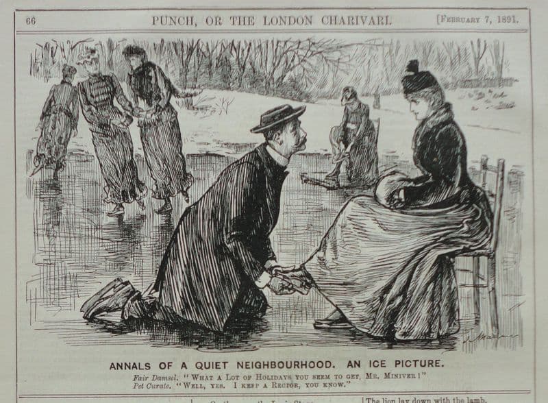 Skating cartoon by an unknown artist - as the signature is hidden in the pond; half-page cartoon from January 31, 1891; 18cm by 13cm. Would look excellent framed ..... The Racketeer knows as he already has a number of these in the study!