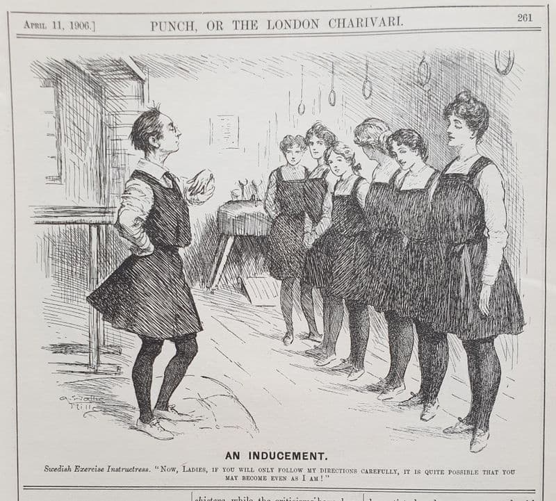 Exercise / fitness cartoon by Arthur Wallis Mills (who illustrated for PG Wodehouse as well as Punch; 18cm by 16cm; two-thirds page cartoon from April 11, 1906. Would look excellent framed ..... The Racketeer knows as he already has a number of these in the study! It would appear that female European exercise gurus are not a modern-day phenomenon!