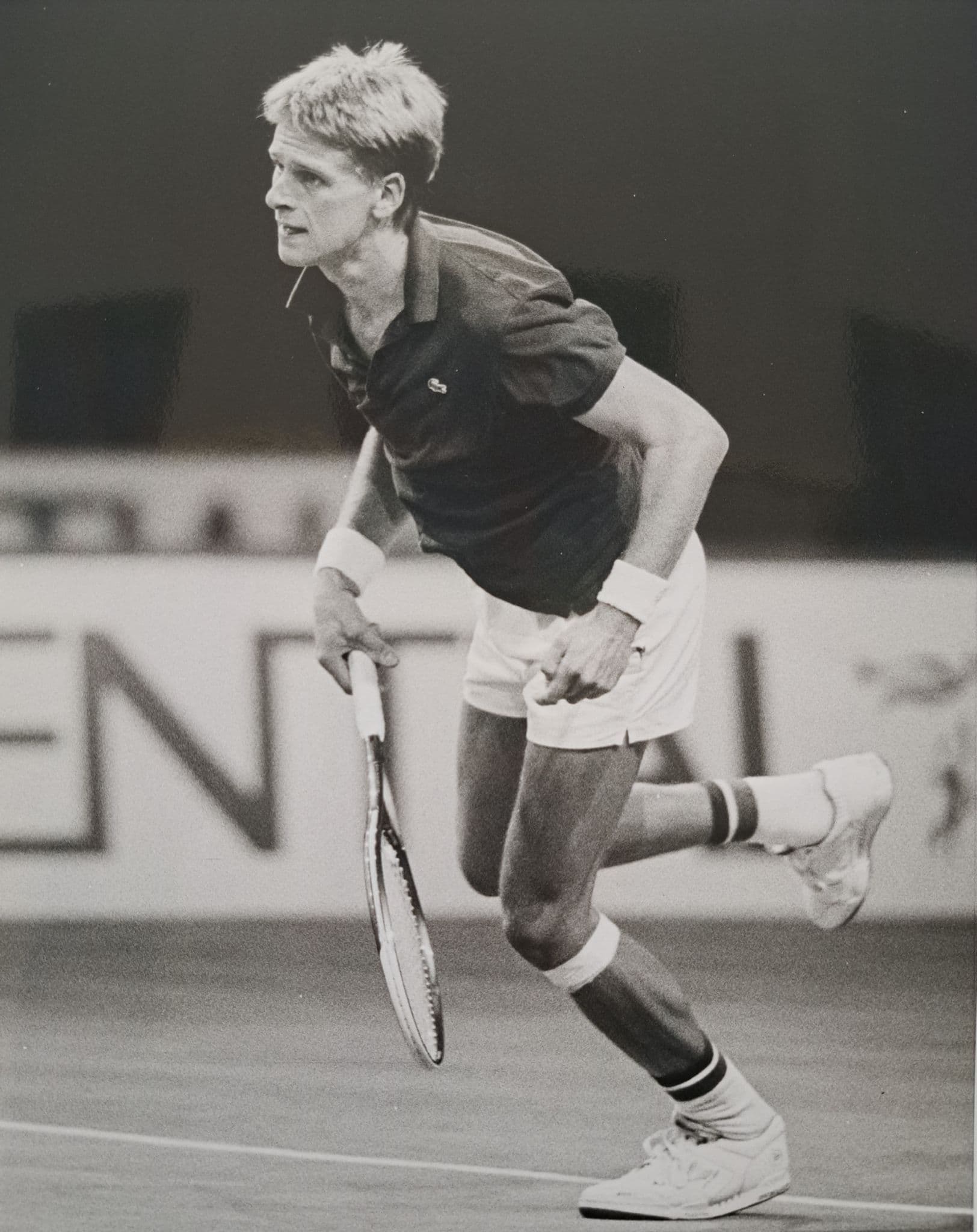 Black and white press photo showing Somerset's Andrew Castle - possibly at one of the LTA National Championships; 19.5cm by 24.5cm; portrait; photograph by Bob Thomas