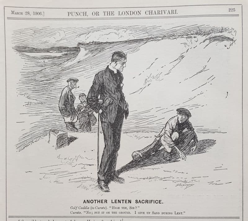 Golf cartoon by Claude Allin Shepperson; two-thirds of a page cartoon from March 28th, 1906. Would look excellent framed ..... The Racketeer knows as he already has a number of these in the study!