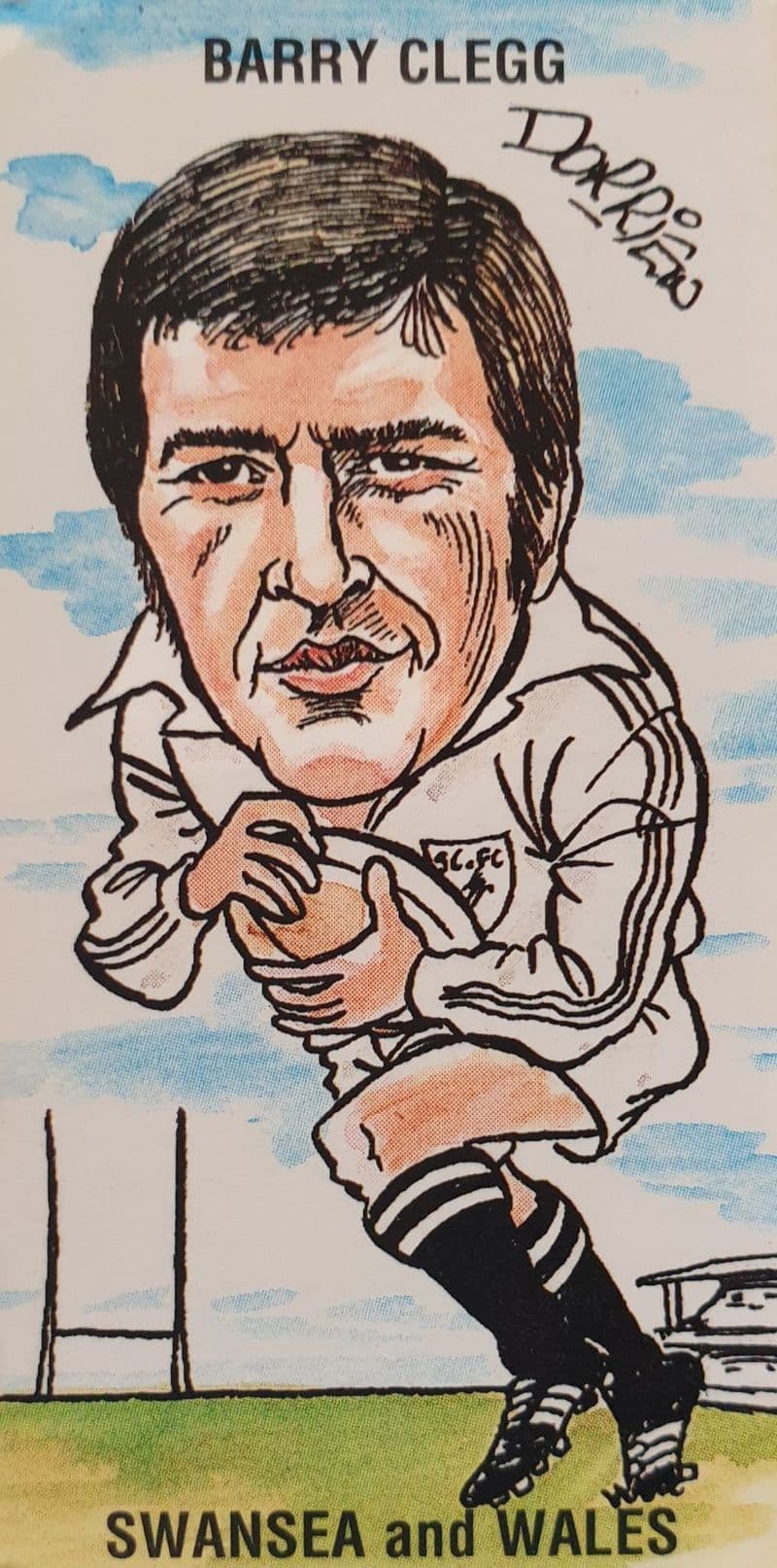 One cigarette card from the Ritchie & Co "Arms Park Heroes" set, given away in 1994; colour cartoon, in good condition; card is number22 (of 25) - Barry Clegg of Swansea and Wales