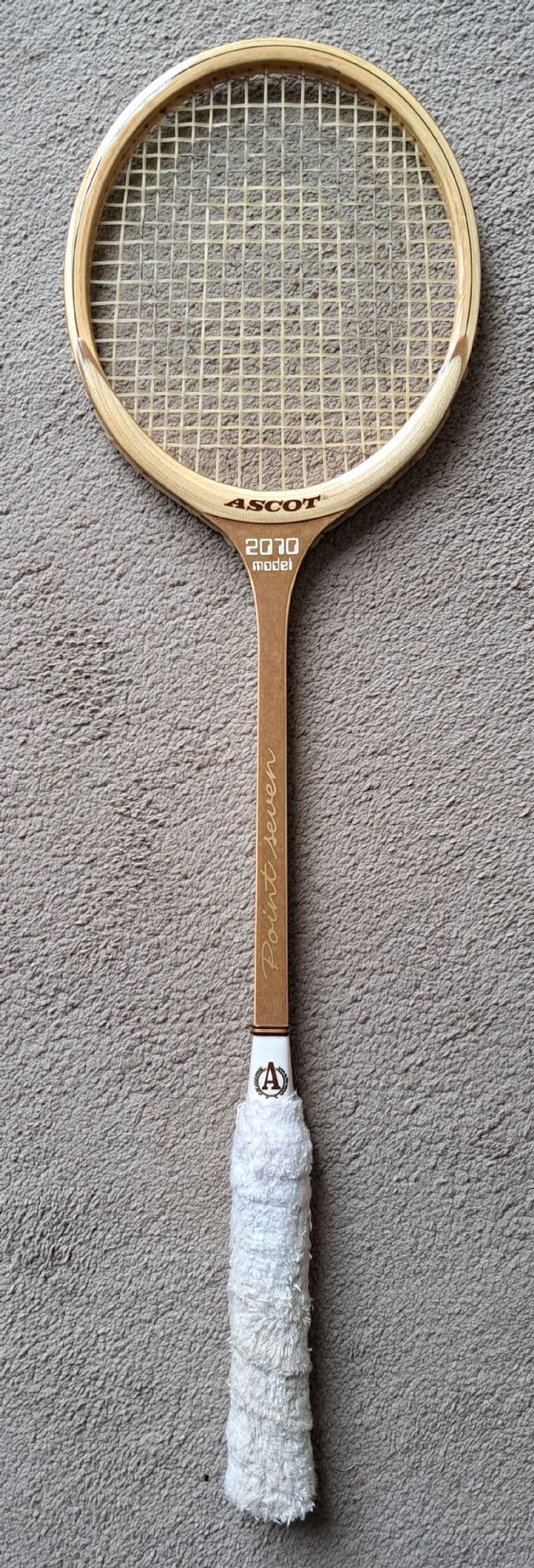 Ascot 2070 Point Server model - which was linked to both squash and tennis; brown and gold paintwork; towelling grip has been added; synthetic strings; used, in good condition; comes with a brown and gold cover