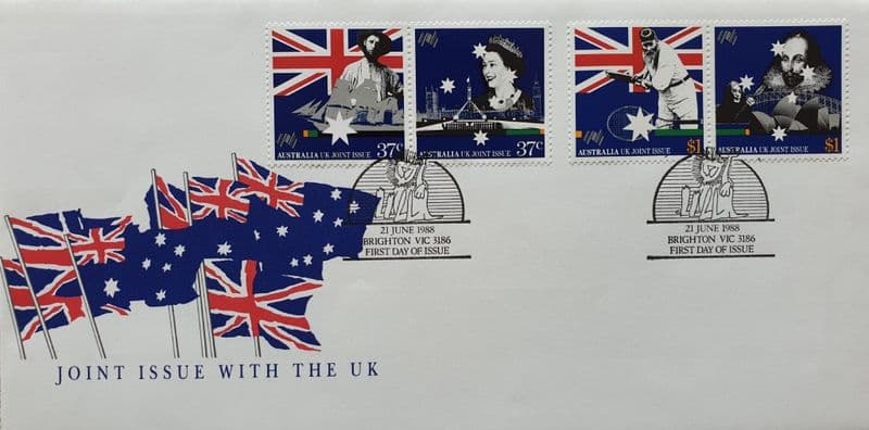 First day cover, to celebrate the Australian Bicentenary in 1988 - left-hand side of the cover has the words "Joint Issue with the UK" below Australian flags; postmarked 21st June 1988, with a Brighton Vic postmark; has two 37c stamps and two $1 stamps (one of which depicts WG Grace); in good condition