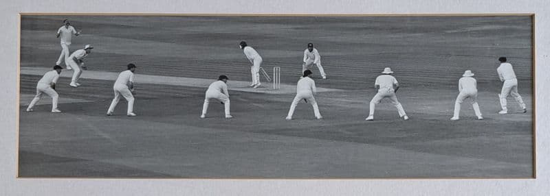 Framed black-and-white photo, showing 8 Australians (plus the wicket-keeper) surrounding the batsman - with Merv Hughes the bowler; the bat / bizarre leaving technique, would suggest that Jack Russell is the English batsman; image is c.12cm by 37cm - the border to the frame is an additional 5cm