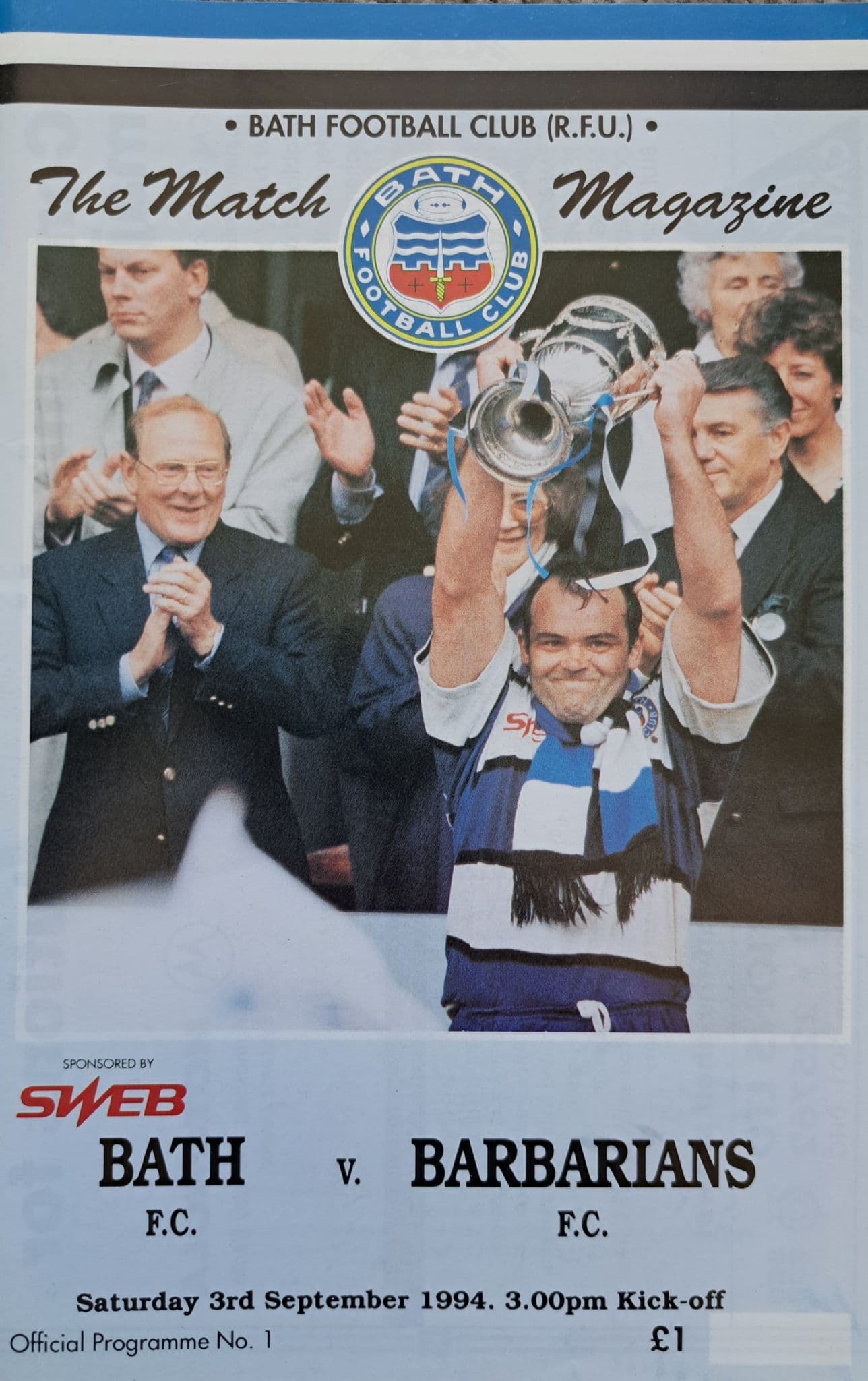 Programme from the game between Bath and the Barbarians - played on Saturday 3rd September,1994. In good condition, with no writing; 36 pages; includes match ticket