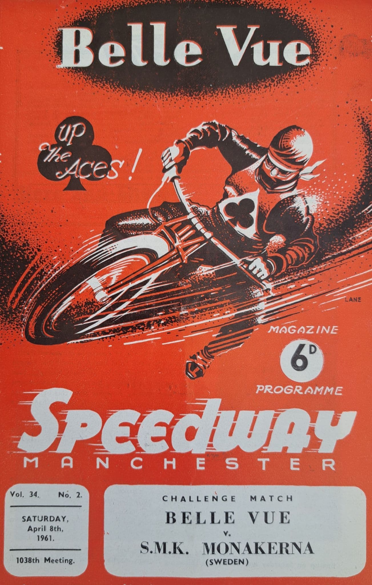 Programme from the Challange Match, held at Belle Vue Speedway Track (Manchester), on Saturday April 8th, 1961; 8 pages; in fairly good condition, with slight signs of pocket wear and results added