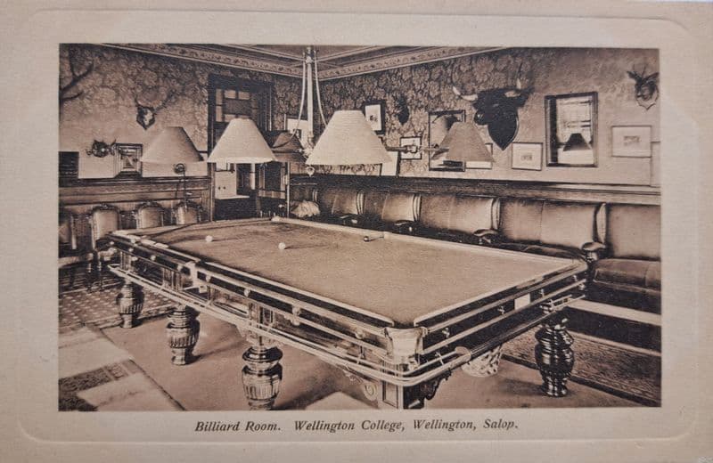 Black and white postcard, showing the billiard room at Wellington College in Salop; c.14cm by 9cm; "W Stackemann & Co" to the rear and the number "1113"; postally un-used and in good condition; image is set slightly in relief