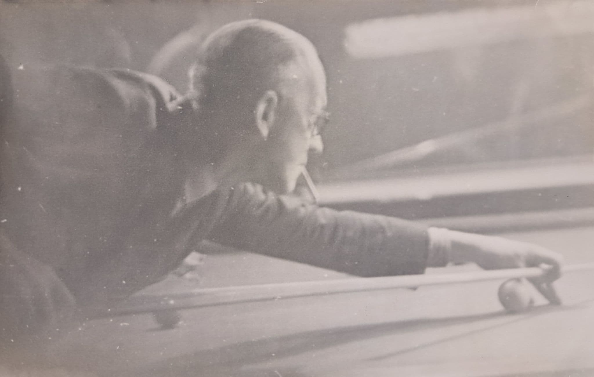 Black and white postcard, showing a gentleman smoking a cigarette whilst playing billiards or snooker; c.13.5cm by 9cm; there is a "K" to the rear, but no obvious maker's name or information