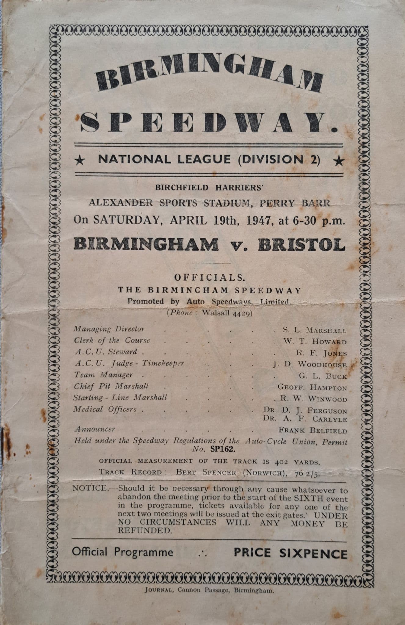 Programme from the League Division II match, held at Perry Barr Stadium (Walsall), on April 19th, 1947; 16 pages; in fairly good condition (for its age), with results added and some pocket folding / wear - Birmingham took on Bristol