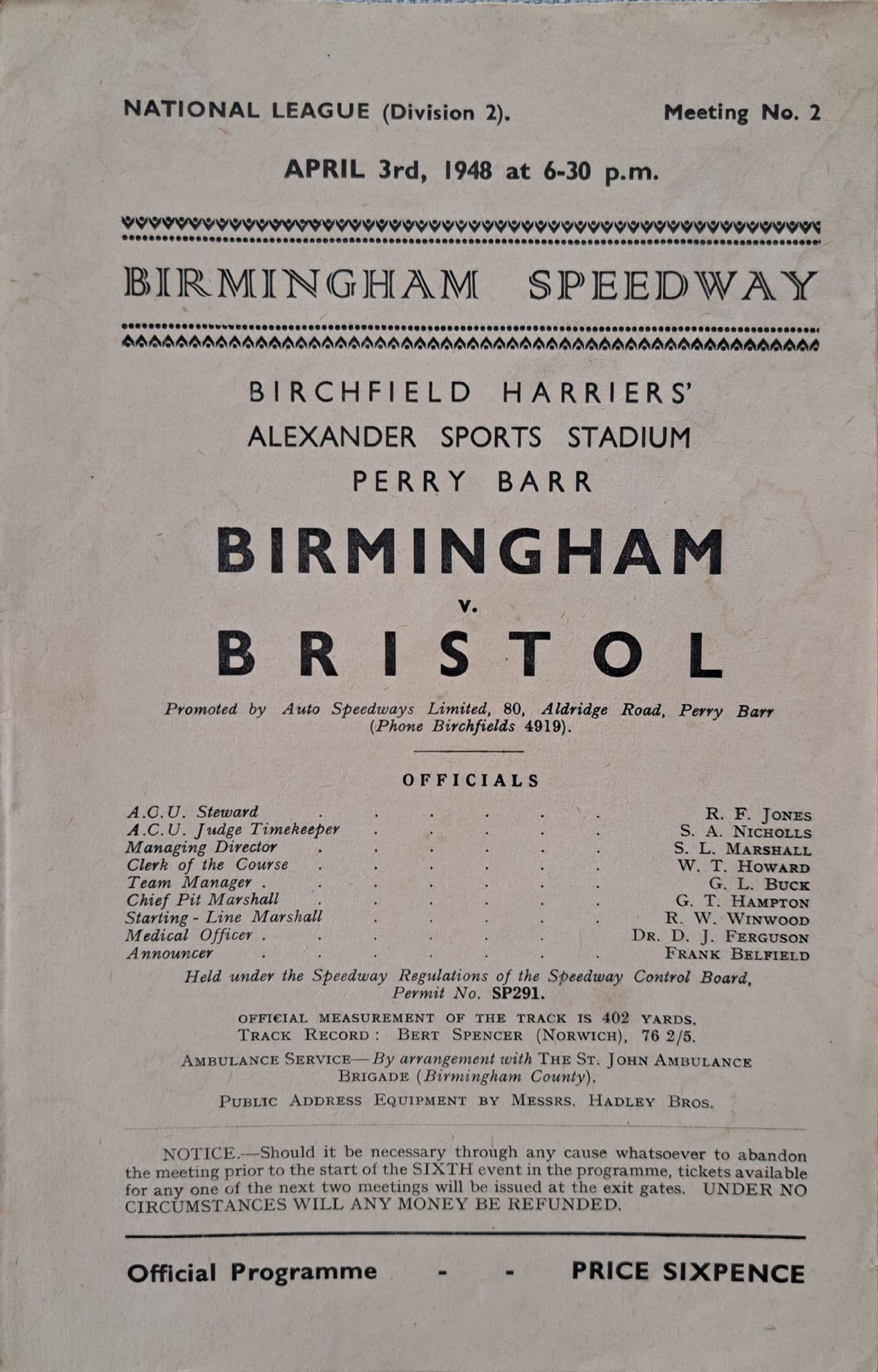 Programme from the League Division II match, held at Perry Barr Stadium (Walsall), on April 3rd, 1948; 8 pages; in good condition (for its age), with results added and slight pocket wear - Birmingham took on Bristol