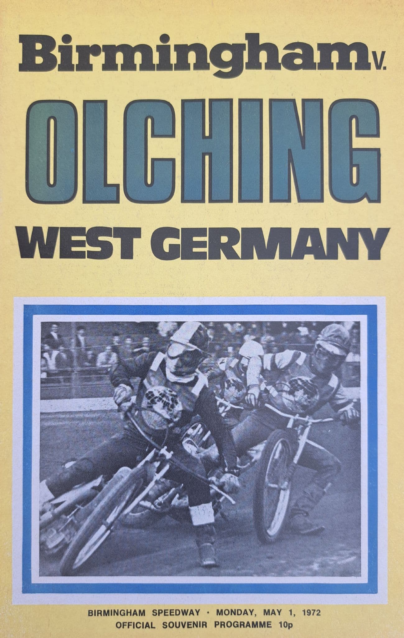Programme from the International match, held at Perry Barr Stadium, on May 1st, 1972; 12 pages; in good condition, with individual scores added but no race details - Birmingham Brummies took on the the touring Olching of West Germany