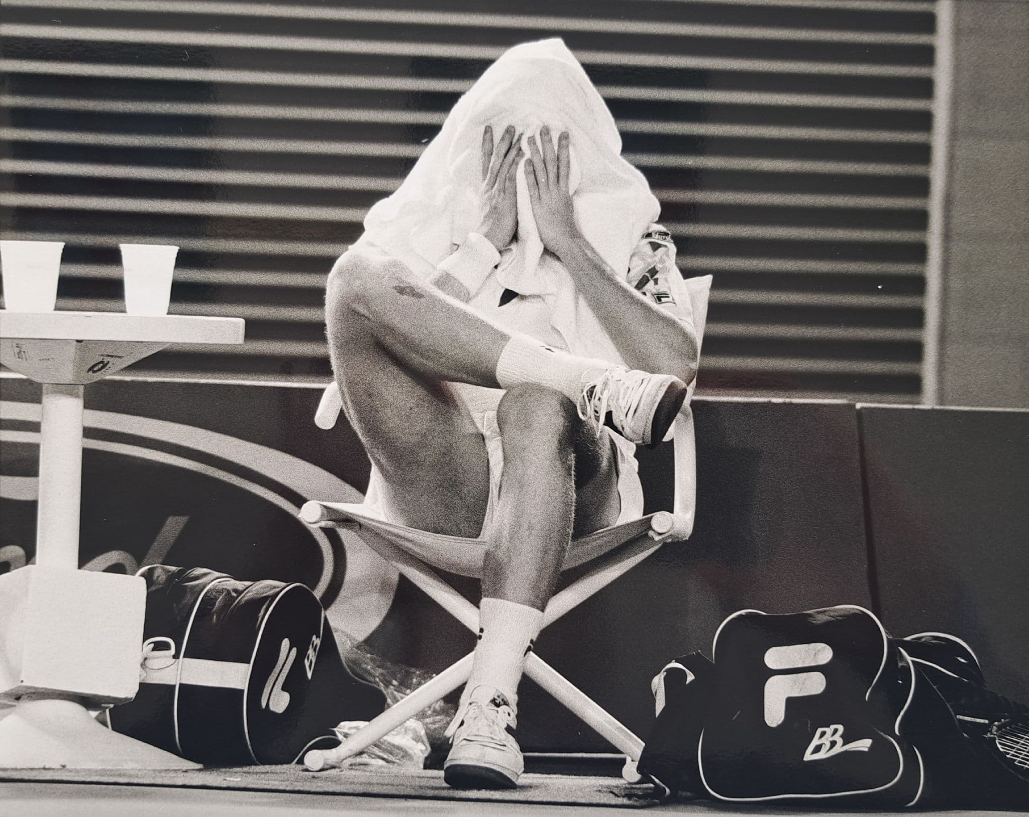 Black and white press photo; 19.5cm by 24.5cm; picture shows Boris Becker at the Australian Open in 1990; photograph from a collection by Bob Thomas, with press marking to the rear