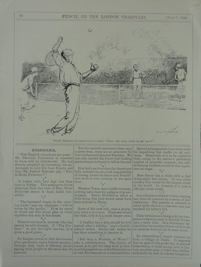 Tennis cartoon by Ernest H Shepard, who illustrated for Punch from 1920 until 1953 (and illustrated Winnie the Pooh!); black and white, half-page cartoon from July 7th, 1920 - entitled "Bright Beginner". Would look excellent framed ..... The Racketeer knows as he already has a number of these in the study! Measures approximately 18cm by 12.5cm