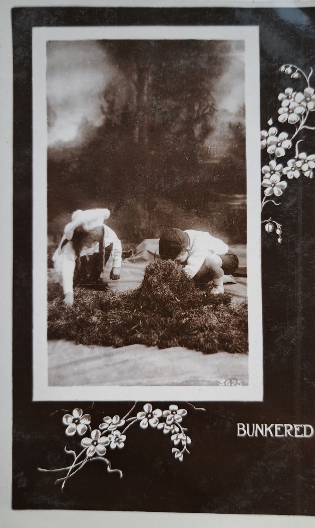Used post card, showing two children looking for a lost ball; message to rear; in good condition; postmark dated 1909; c.8.5cm by 14cm; part of the Davidson Brothers Photography Series No 3625