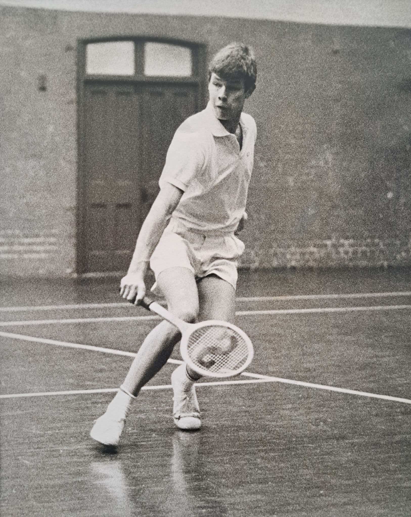Black and white press photo showing Britain's Buster Mottram in January, 1972 - beating Devon's Chris Kaskow in the British Junior Covered Court event; 19cm by 23.5cm; portrait; Press Agency information to the rear