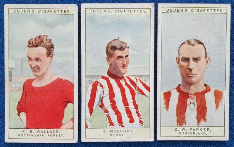 Three colour football cards, from the "Captains of Association Football Clubs & Colours" - produced by Ogden's in 1926; in fairly good condition; cards show RS Wallace of Nottingham Forest (28), R McGrory of Stoke (38) and CW Parker of Sunderland (39)