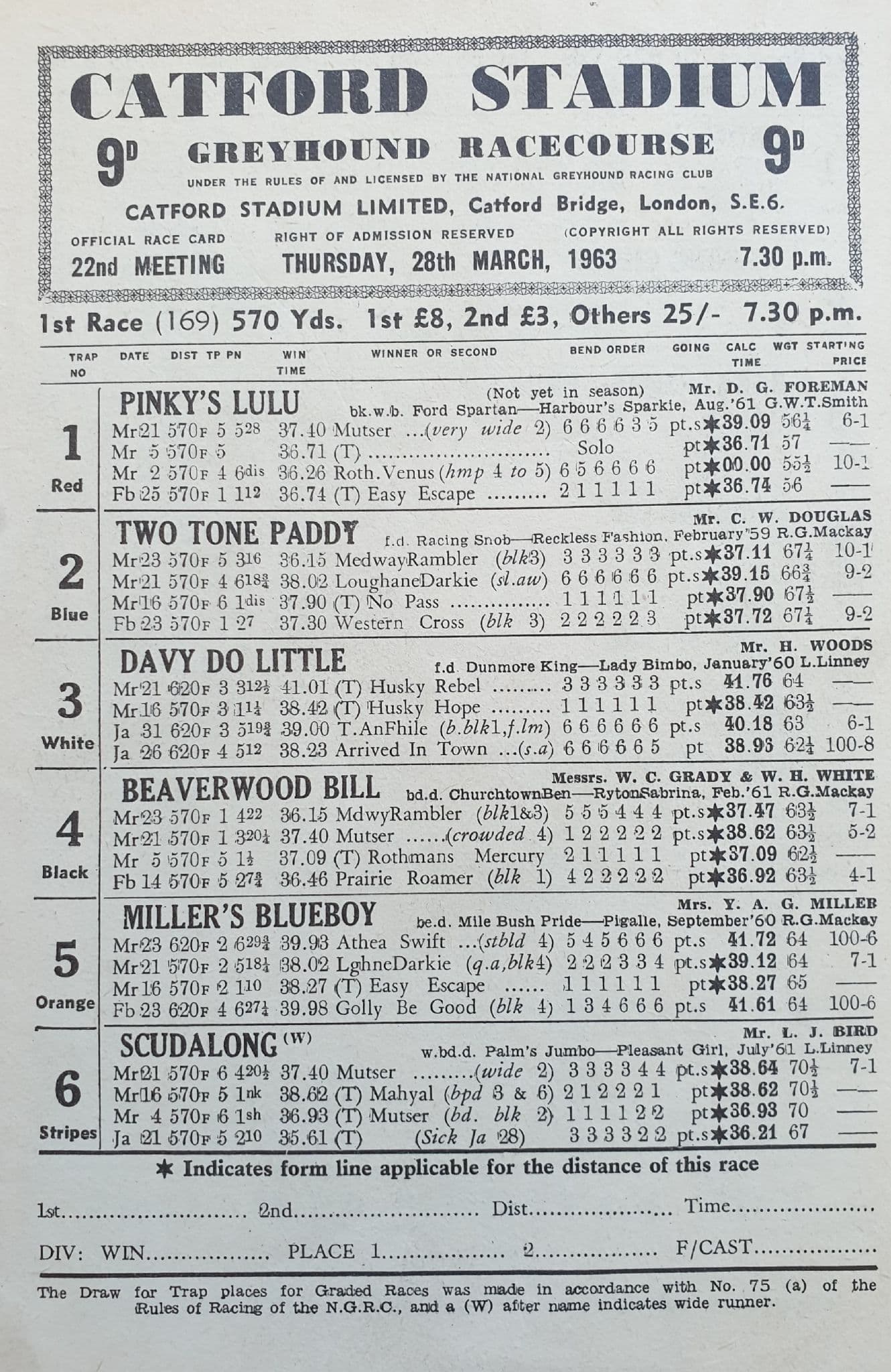 Catford Greyhound Card (1963, Mar 28th)