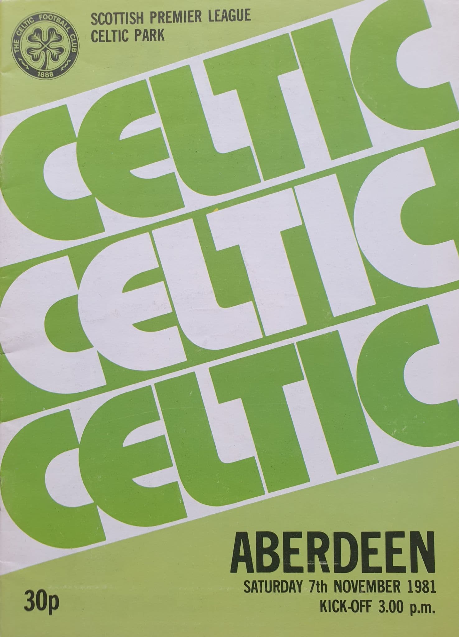 Programme from the Scottish Premier League game between Celtic and Aberdeen at Celtic Park; played on Saturday March 28th, 1981; 24 pages; in fairly good condition, with no external marking or writing; the teams included Charlie Nicholas and Jim Leighton