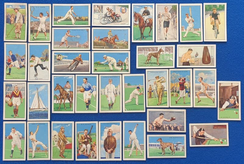 35 of 48 cigarette cards from the Gallahers (Park Drive) "Champions set, given away in 1934; colour pictures, in good condition; updated version with names to the front of the cards; the cards feature a variety of sports; numbers are 1, 2, 5-14, 16, 17, 20-24, 26, 28-31, 32, 33-40, 43-45