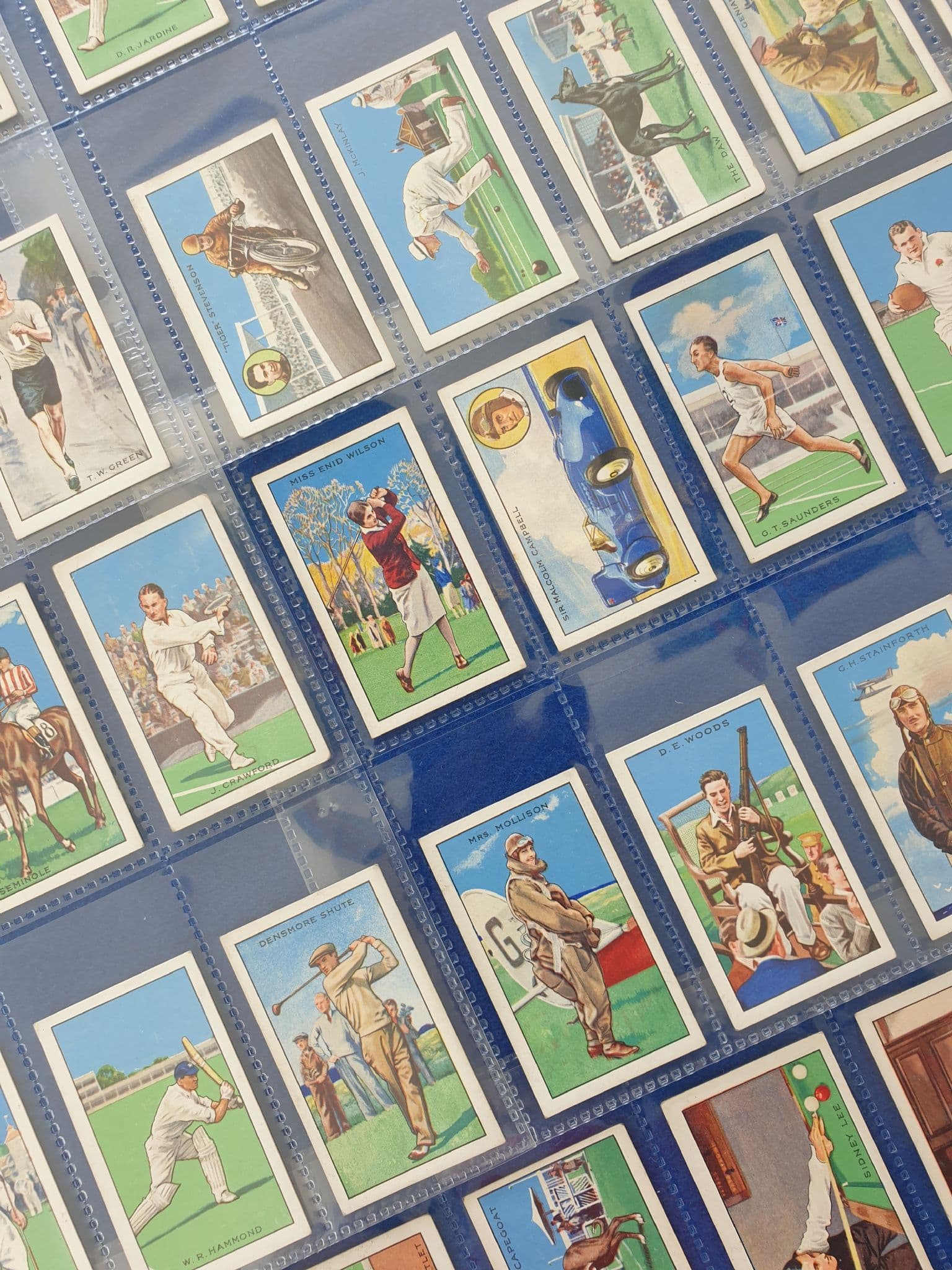 A full set of 48 cigarette cards from the Gallahers (Park Drive) "Champions set, given away in 1934; colour pictures, in good condition; names to the front of the cards - with images which had been re-drawn from the original issue; the cards feature a variety of sports including tennis (4), cricket (4), horse racing (3) and greyhound racing (5)