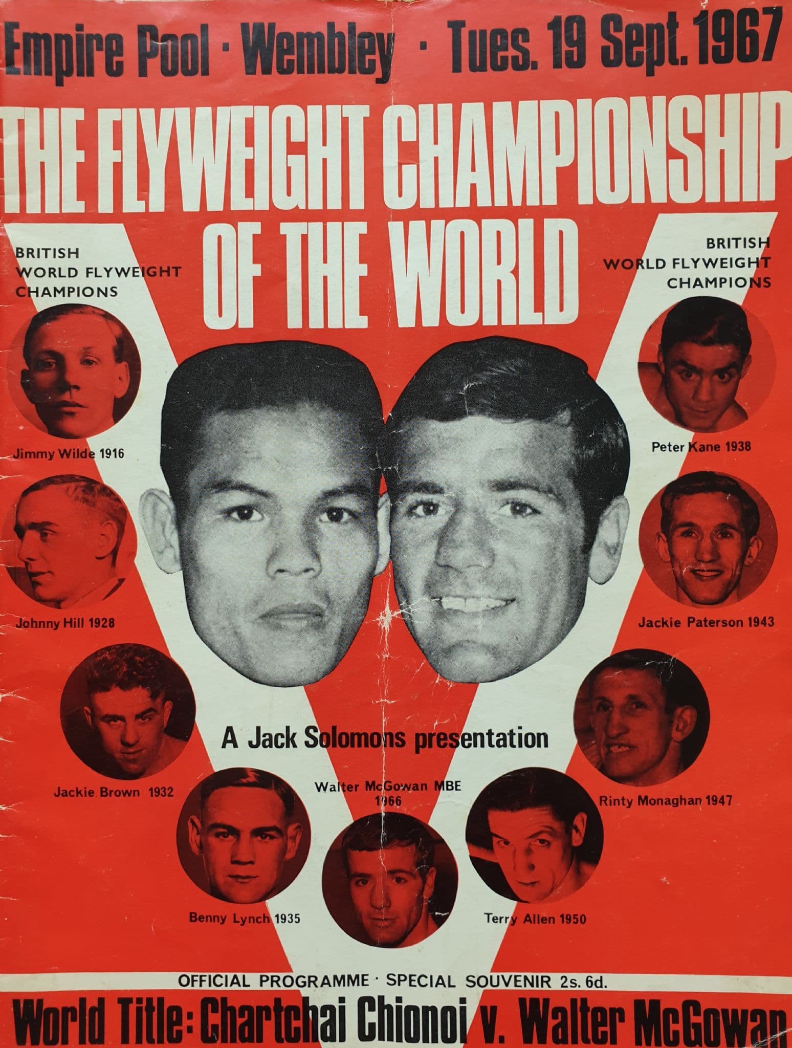 World title fight for the Flyweight Championship, between Chartchai Chionoi and Walter McGowan; held at the Empire Pool, Wembley, on Tuesday September 19th, 1967; in fairly good condition, with a vertical pocket fold, but no writing; Jackie Turpin was also on the card