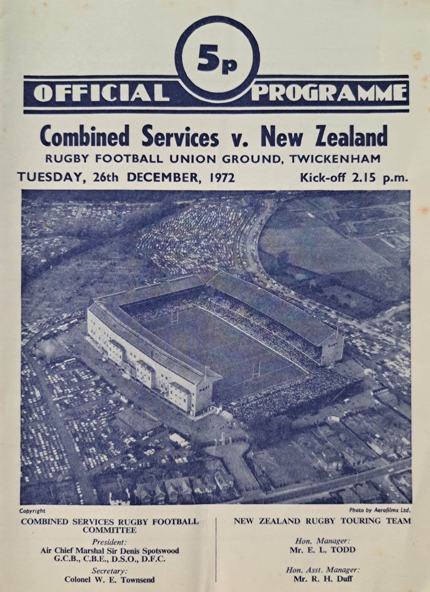 Programme from the match between a Combined Services XV and the touring Australians; played at Twickenham on Tuesday December 26th, 1972; simple 4 page fold-over design, with a picture of the three-sided ground on the front cover; in good condition, with the visitors team listed in pencil on the centre page