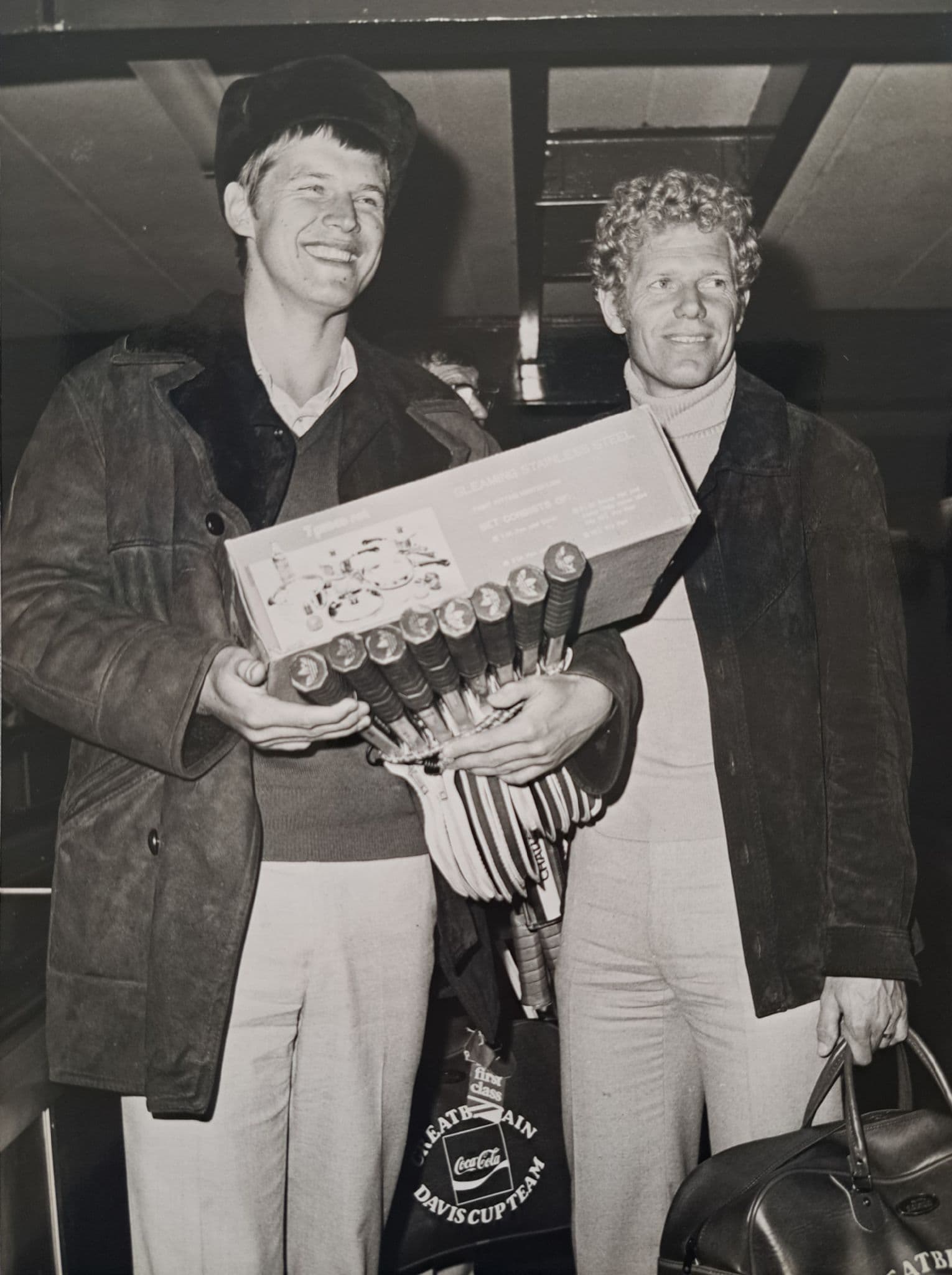 Black and white press photo showing Britain's Mark Cox and Buster Mottram - returning from a Davis Cup tie in California; 17.5cm by 23.5cm; portrait; photograph by Press Association