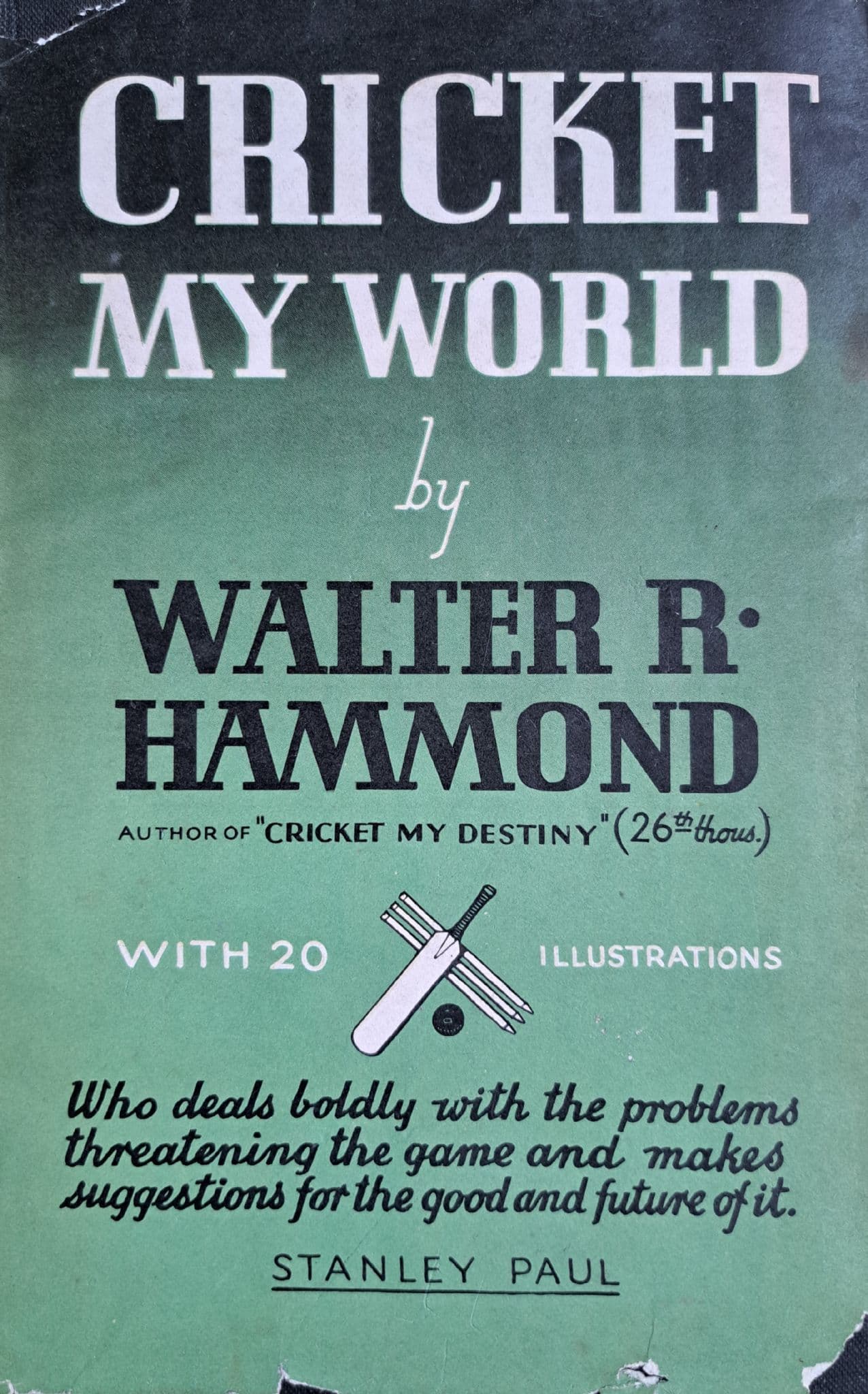 Published by Stanley Paul - there is no stated publishing date; the England and Gloucestershire batsman describes cricket from around the world; hard cover with dust jacket - internally the book is in good condition, with some mild spotting to the page edges - however, the dust jacket is in poor condition, with rips / splits to the spine and edges; 156 pages; 20 illustrations