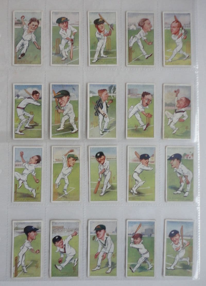 A delightful, and complete, set of 50 cricket caricature cards of famous players batting or bowling (or even smoking a pipe!), each surrounded with a white border; produced by John Player & Sons in the 1926; cartoons themselves drawn by the infamous "RIP"; once mounted, would make a delightful focal point in the bar at "The Cricketer's Arms", or at the local club