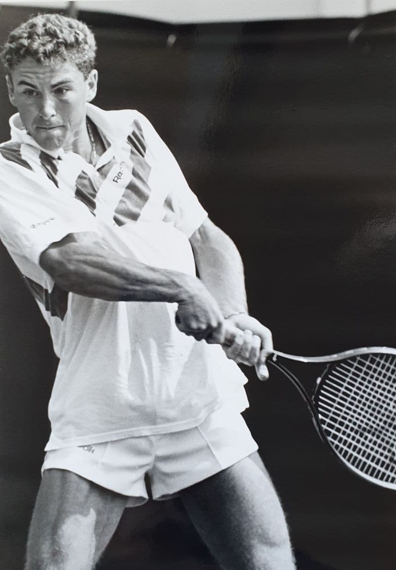Large black and white press photo, showing Surrey's Danny Sapsford hitting a trademark backhand; 17cm by 24cm; portrait; photograph by Tommy Hindley (Professional Sport)