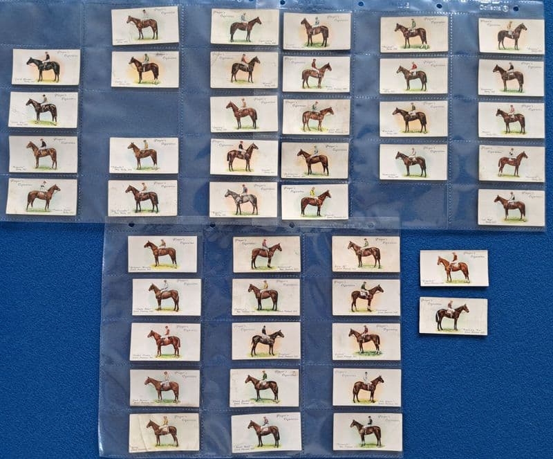 44 cigarette cards from the John Player & Sons "Derby and Grand National Winners" set, given away in 1933; colour photo, in fairly good condition; missing cards are 8, 11, 25, 48, 49 and 50 - card 45 is creased