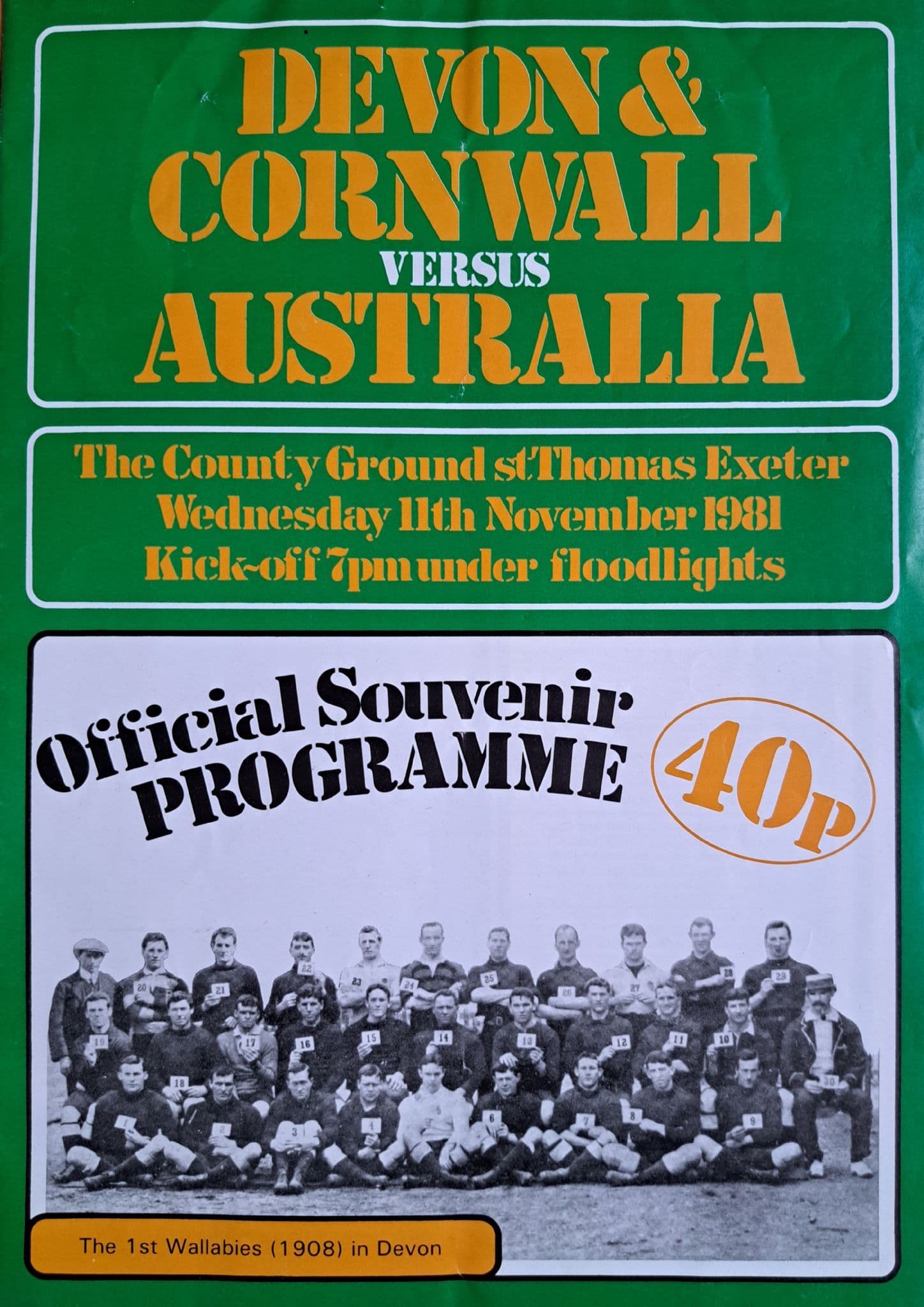 Programme from the match between a combined Devon & Cornwall XV and the touring Australians; played at the County Ground, Exeter on Wednesday November 11th, 1981; 4 page fold-out format; in good condition