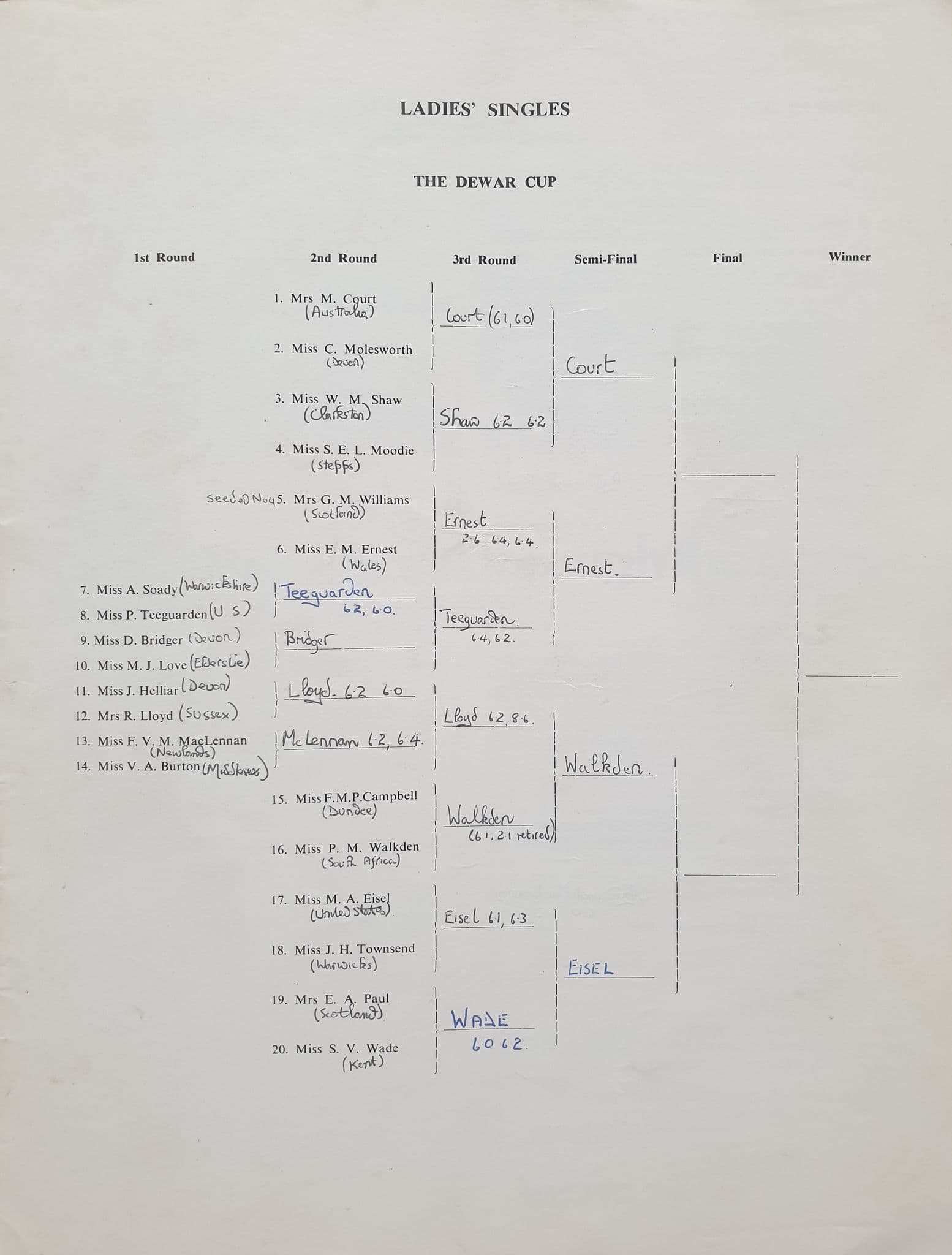 Tournament programme from 1968, and the second of six events across the UK - back in the the days when whisky and tennis could be easily linked; generally in fairly good condition, though does have some marking to the front cover, and a slight pocket fold - some results added neatly in pen to the various draws
