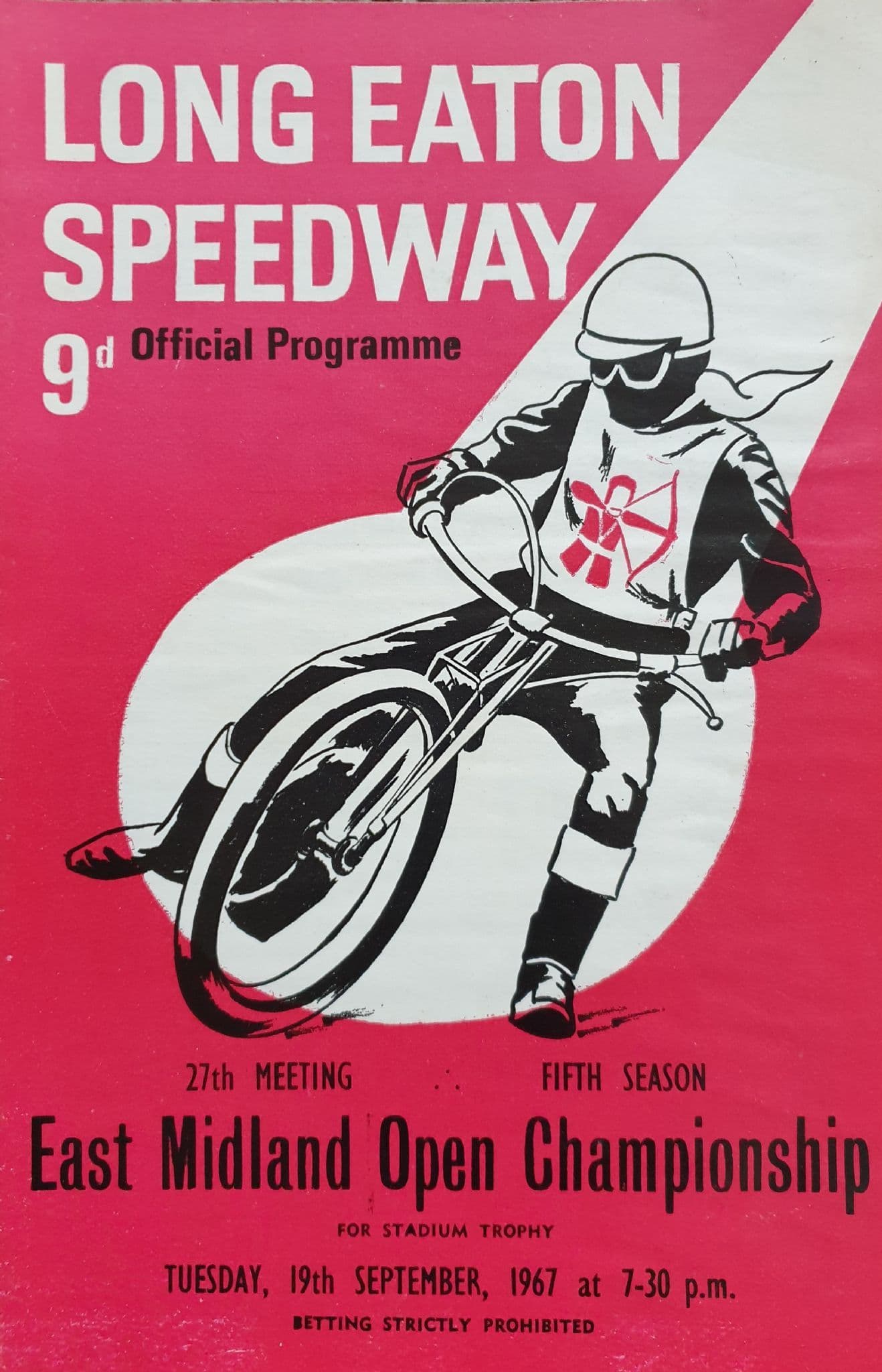Programme for meeting 27 in the fifth season of speedway at Long Eaton - the East Midland Open Championship; 8 pages; in good condition, with no writing or marking