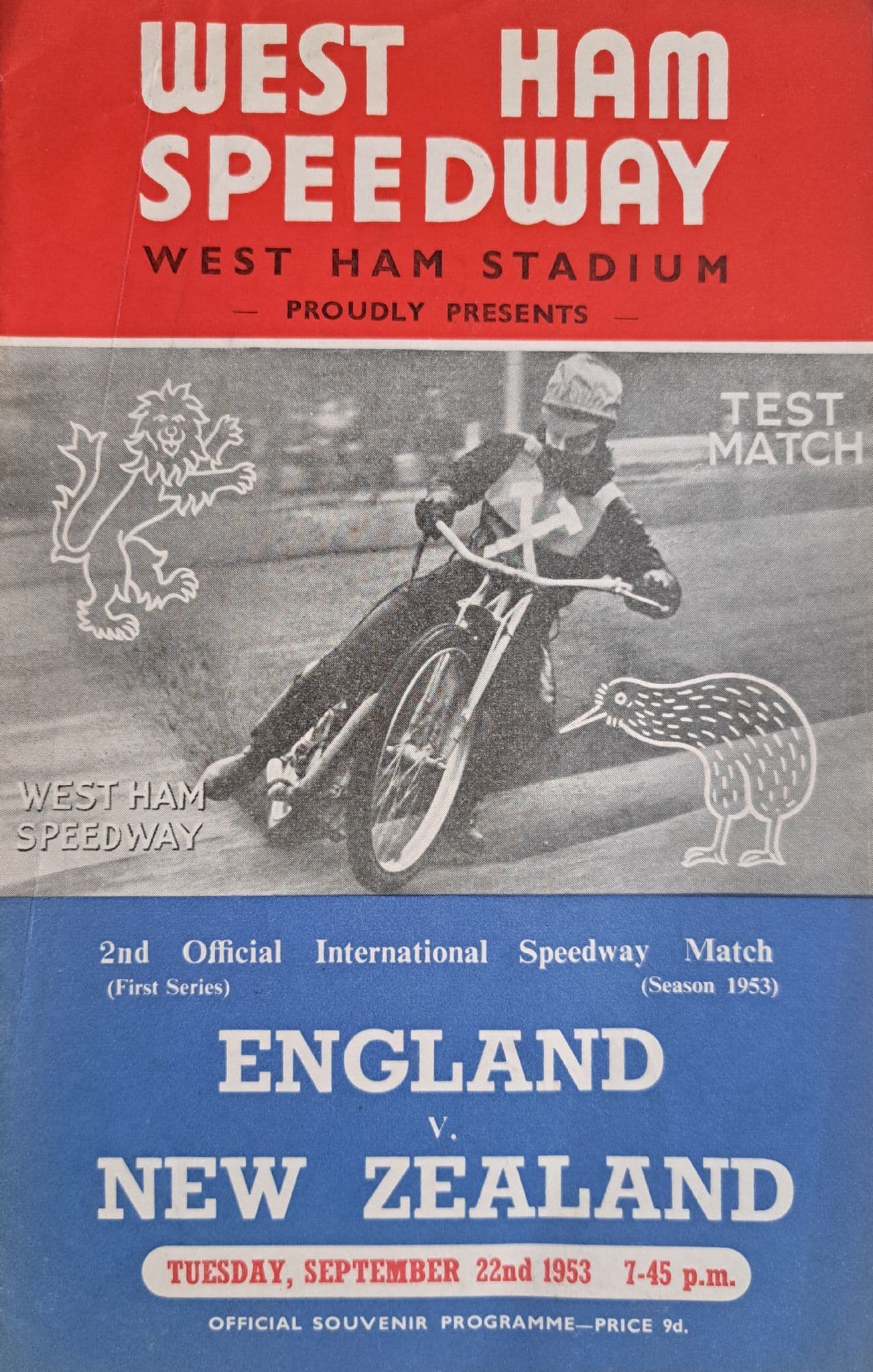 Programme from the England v New Zealand Test Match, held at West Ham Speedway Track, on Tuesday September 22nd, 1953; 12 pages; in good condition, with results added in pencil to the centre pages