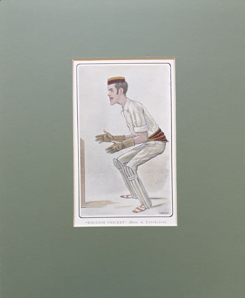 Hand-coloured SPY picture (possibly from a book or magazine), which shows the Hon A Lyttelton keeping-wicket; comes with green backing and mount ready for framing; border is about 23cm by 28cm, with the image 15.5cm by 9.5cm