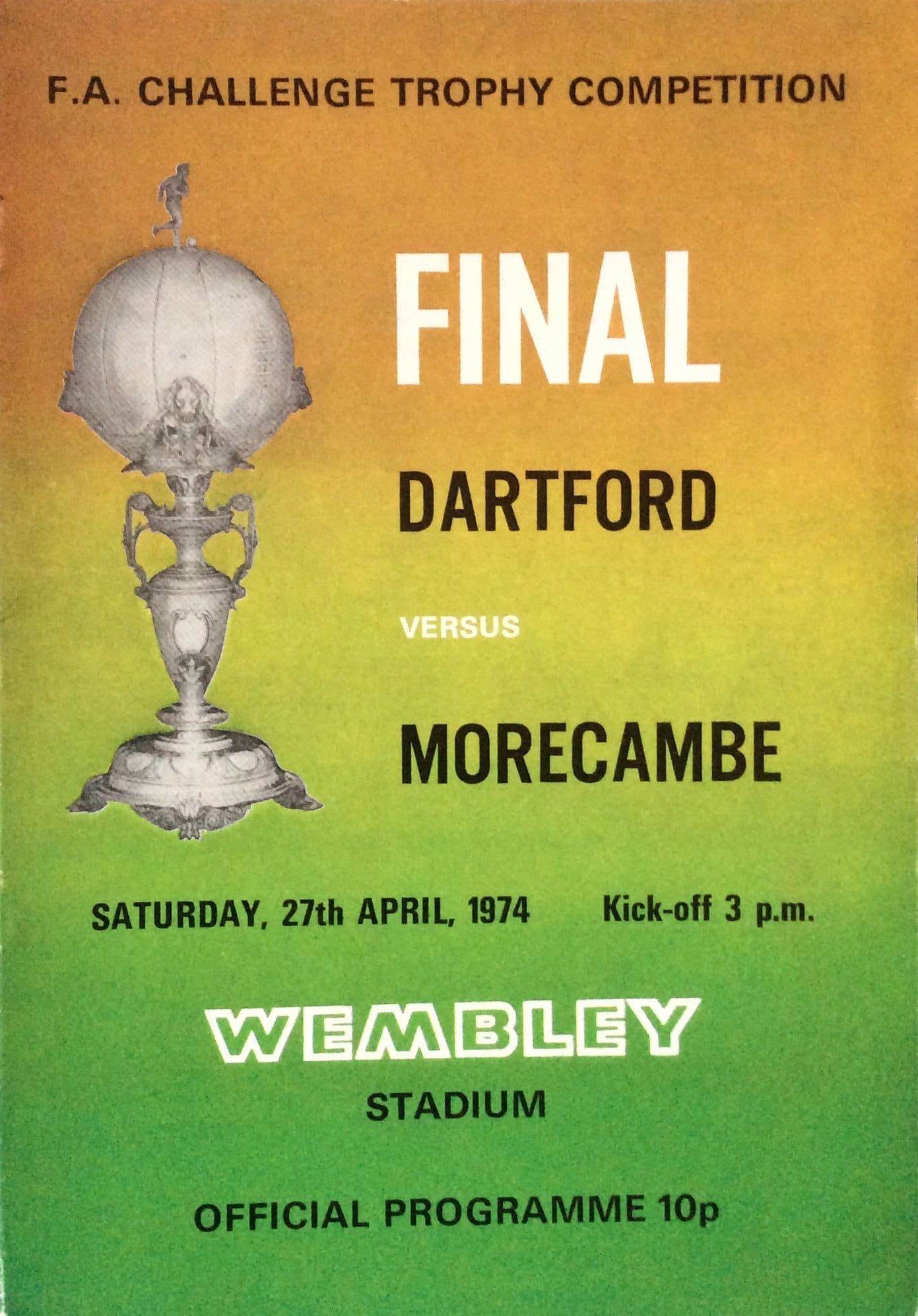 Programme from the FA Challenge Trophy Final which took place between Dartford and Morecambe , on Saturday April 27th (1974), at Wembley Stadium; programme is in very good condition; Morecambe won 2-1