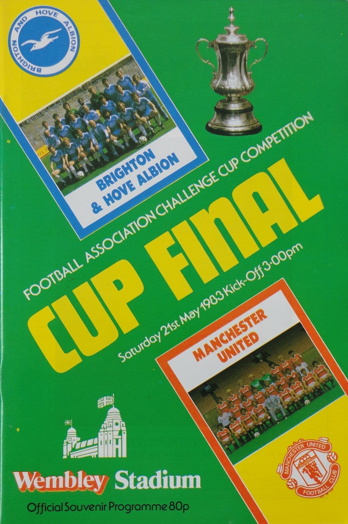 Programme from the FA Cup Final between Brighton & Hove Albion and Manchester United; match played at Wembley Stadium on Saturday May 21st, 1983; programme in very good condition, with no external marking; 62 pages