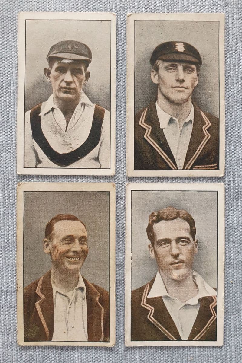 Four cards from of the "Famous Cricketers", given away in packets of Godfrey Phillips' cigarettes; number 39; the cards show HL Collins (10), H Strudwick (18), J Hobbs (22) and F Woolley (28); in fairly good condition