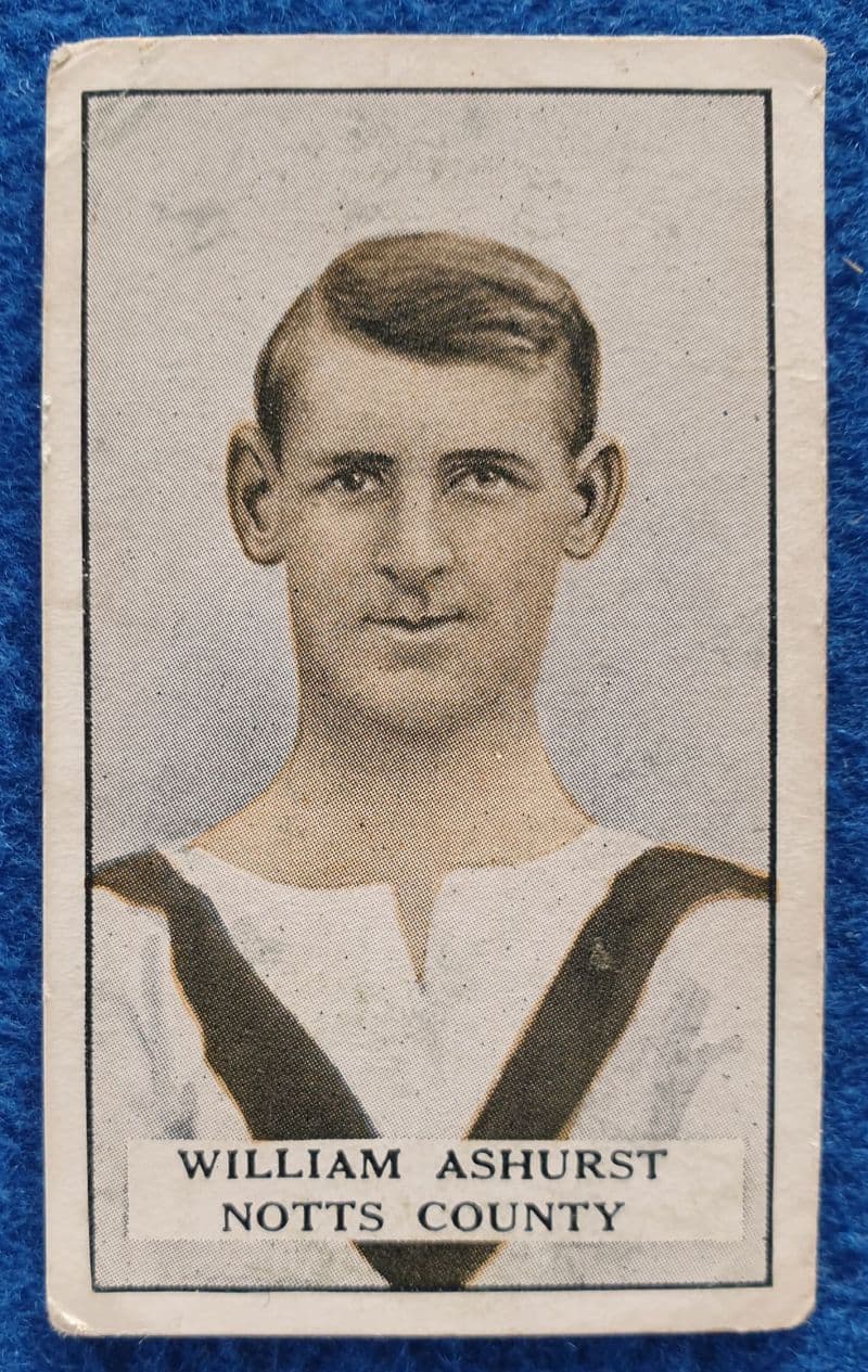 One of the "Famous Footballers cards, produced by Gallahers Ltd in 1925 (number 82 of 100); in fair condition; green back; card shows William Ashurst of Notts County