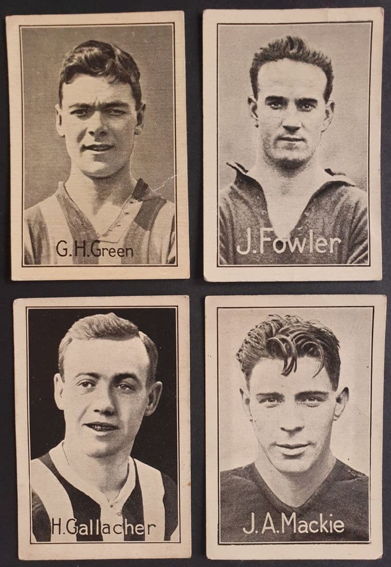 Black and white football cards, one of which came each week with "The Champion" magazine, in 1926; the cards have famous "footer" internationals of the day; in good condition; cards show George Green of Sheffield United (6), J Fowler of Swansea (9), Hugh Gallacher of Newcastle (19) and John Mackie of Arsenal (22)