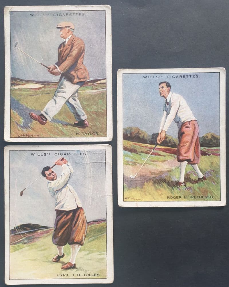 Three (large) cigarette cards from the WD & HO Wills "Famous Golfers" set, given away in 1930; colour pictures, in fairly good condition, with slight rounding of the corners; cards are JH Taylor (20), Cyril Tolley (21) and Roger Wethered (24)