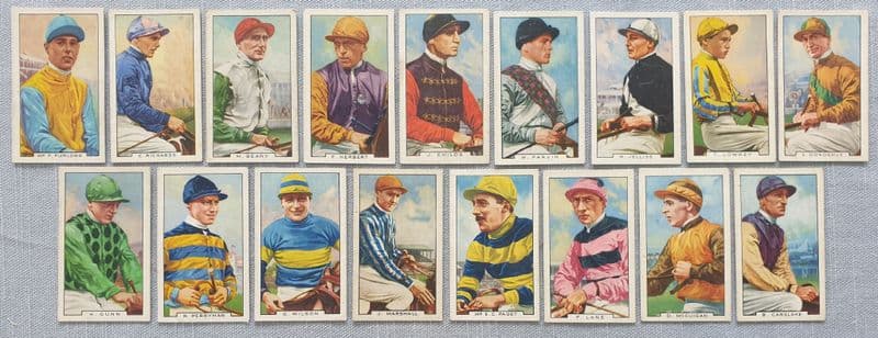 17 cigarette cards from the Gallaher "Famous Jockeys" set, given away in 1936; in good condition; cards are 2, 4, 6, 12, 18, 23, 24, 25, 27, 34, 35, 36, 38, 39, 41, 44 and 46; blue writing to the rear