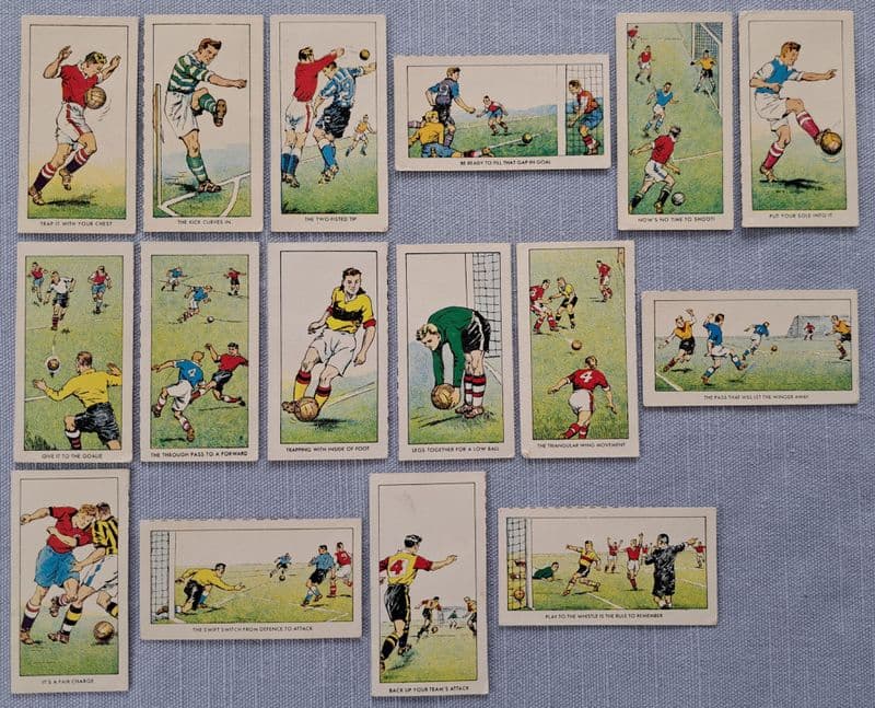 14 of 64 cards from The Rover series "Football Tips and Tricks by the Mystery Trainer", distributed in 1959; mostly in good condition; numbers are 3, 4, 11, 12, 19, 20, 27, 28, 35, 36, 43, 44, 51, 52, 59, 60