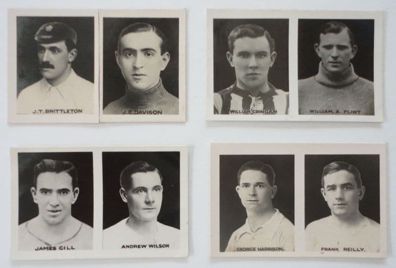 Black and white football cards, dated August 12th 1922; presented with the Magnet Library, which gave you an album to mount the cards in; cards are number 5, JE Davison of Sheffield Wednesday; number 7, William Cringan of Celtic; number 8, William Flint of Notts County; number 10, James Gill of Cardiff; number 11, Andrew Wilson of Middlesbrough; number 16, JT Brittleton of Stoke City; number 22, George Harrison of Everton; and number 23, Frank Reilly of Blackburn Rovers; approximately 3.5cm by 4cm; cards and 5 and 16, are individual - the others in pairs (with measurements 7cm by 4.5cm)