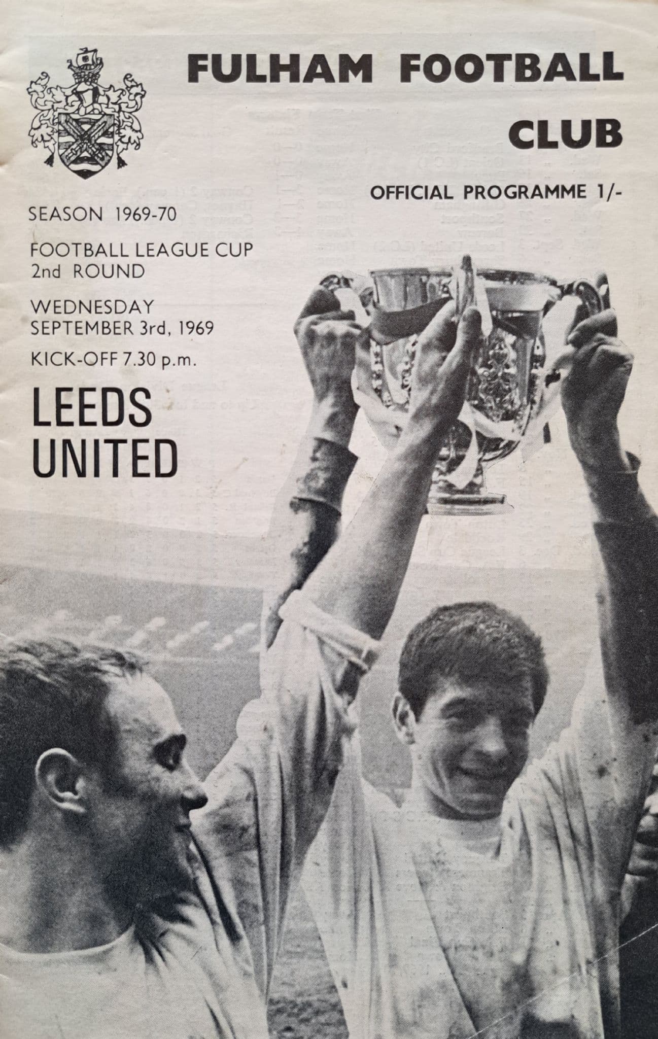 League Cup 2nd Round fixture between Fulham and Leeds; played at Craven Cottage on Wednesday September 3rd, 1969; programme in good condition; 16 pages