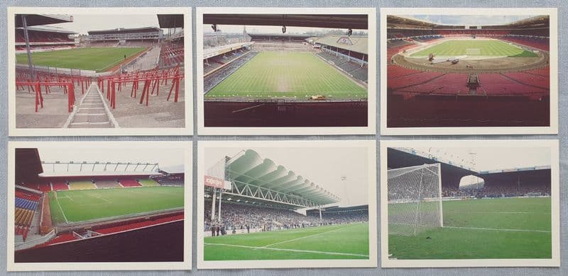 Six postcard sized cards produced by Bassett sweets in 1991 - in conjunction with Match Magazine; in very good condition; grounds are Highbury, Villa Park, Wembley, Anfield, Maine Road and Hillsborough